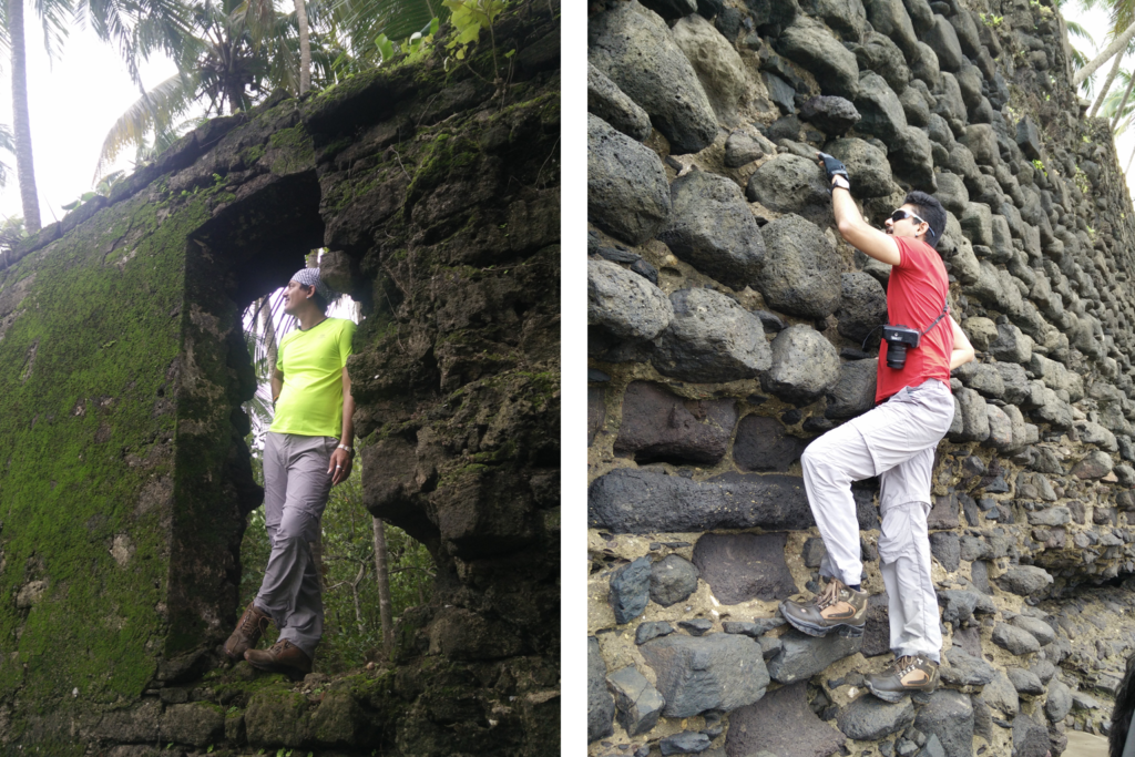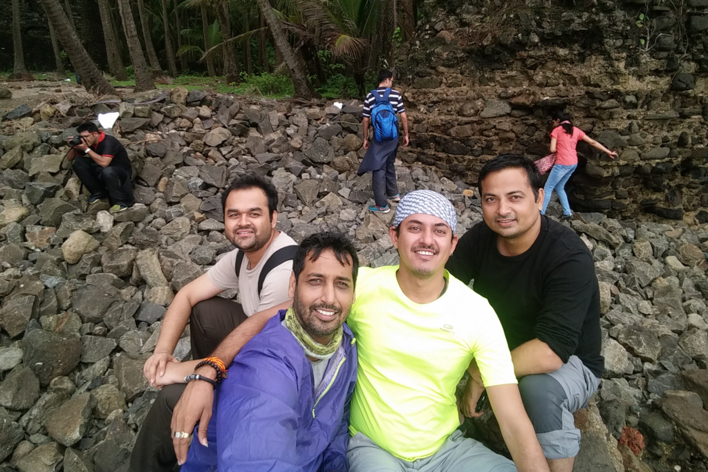 Our first destination is the beautiful desolate ruins of fort- Revdanda. Its an abandoned old skeletal ruin of a once high and mighty fort and a chapel too; as with most places in India sadly in neglected state of affairs. Why is it that we only want to keep creating new and neglect our old pristine or ruined past, however it maybe; it can always be preserved in remembrance? We roam around its precincts, and then sneak into the magnificent clean and clear beach adjoining it, which is the most fun part. Having panaromic views from the beach, having the cool misty air on our faces, solace and peace are to be found on many such pristine Maharashtra beaches. Its high tide time or else as in with my previous rides, where we walked for long miles with Kailash,Rajani,Rohit, and no other souls on there; climbed the fort walls for fun; and just sat and pondered within ourselves:) but for today we didn’t want to get wet in its waters, and hence we just hang by its shore’s on its huge boulders. Chutzpah sets into us again:) and the man of the moment is whom I love to address as ‘mukhyamantri'(cm) devendra; another old enthusiastic rider traveller:) He is brave enough to entertain us all with all his elements at his disposal:)
